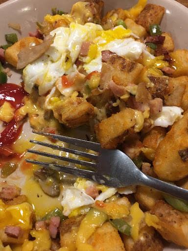 Upon entry, the overwhelming aroma of stale cigarette smoke wafts to your nose while the antiquated upholstery give presence to the thought that it must have been cleaned as recently as 1957. The food was precisely what one would expect from such an establishment including the hash browns, crisp on the outside while maintaining a cool, oily center. The scrambled eggs may have been prepped by the same chef, because they had the same characteristics. The omelette on the other hand, was a true to form exquisite combination of over cooked egg and undercooked fillings...including the rather poorly prepared clump of hair, which was apparently gratis because it wasnt listed as an ingredient on the menu. The wait staff was kind enough, but reserved enough homlieness to suit the deco of this solid ½ star eatery.