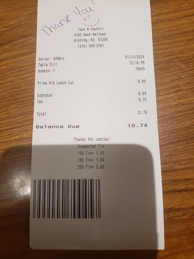 The Food was excellent. It was the best Prime Rib Ive had in years in Wichita KS. It was a huge piece and a thick slice, done to my specifications which was medium rare and very flavorful, better then Scotch & Sirloin and less expensive.. My Husband had T-Bone steak, he was just as pleased. We thought the atmosphere was pleasant. Its an Old fashioned looking place but clean and very comfortable, seemed like all the guests were happy and friendly as well. Our waitress was helpful and friendly. We plan on going back often. We also plan on trying breakfast there.