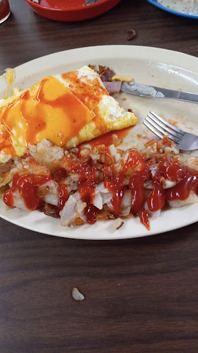 Smoking?! In the restaurant?! And no marked smoking/non-smoking sections? If only I had known before I ordered. Whole restaurant is wide open, old timers over at their table - until the waitress asks them to move over to the big table right next to mine where they proceed to light up. On top of that, aside from the eggs nothing seems to be fresh: frozen hash brown patties, frozen meats, instant grits out of a packet... I could have fixed this at home and done a better job. This also must have been bring your kid to work day, because there was a squalling, coughing baby in the back that the waitress kept checking on. Dont worry, she didnt wash her hands before handling food. Going to be upset if I get sick. I get that childcare is difficult, but germs?!