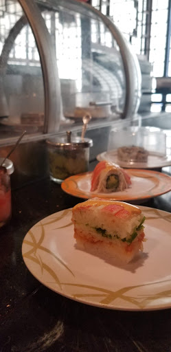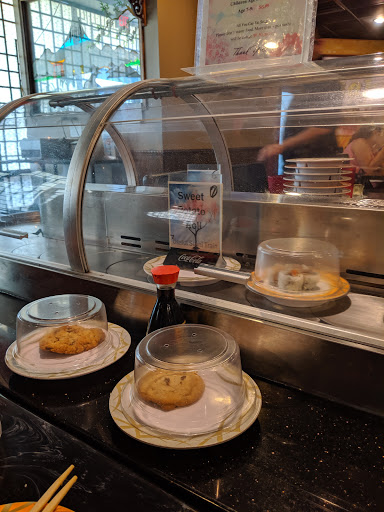 Honestly, I was initally intrigued by the sushi train until I realized the temperature was less than cool inside where the sushi was stored. Upon trying one (against my better judgement), the rice was sticky and warm and it took everything I had to swallow it down. Luckily, I had ordered the Godzilla roll which is fried so I felt safe eating it but I was served 5 pieces when it advertised 6 pieces. I had one of my spicy tuna rolls and gave up. My date ordered yellowtail sushi and tuna and although it was cool to touch it looked very old and the colors of the fish concerned us so it was left undisturbed. The service was fine aside from the fact they left a cart with dirty dishes in the middle of the dining room with uncleaned tables. When the next couple walked in, they had to get it out of the way first because they couldnt sit them down. I am kicking myself for not doing better research than google especially with decent places down the road.