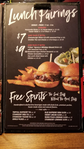 I cant imagine how the ratings are so high for this location. I guess a lot can happen in a years time though since last reviewed. We visited for the last time today undoubtedly. First off no one was there to greet us, we stood for about 3 minutes before a waiter came and sat us. Next up was dirty silverware, not like water stains either, like old dried food particles dirty. Disgusting. Sitting there waiting for our drinks to arrive I looked over at the partition of our booth and the pictures on it. I couldnt make out the pics between the dirt, splattered old food and kids fingerprints slathering the glass. GROSS! Ive about lost my appetite at this point. We ordered our food and it arrived fairly quickly. My mother got the Bruscheta chicken and I got the Jack Daniels sampler as a meal. I asked the waItress when ordering if the fries are seasoned like in the picture in the menu. She said "yeah theyre seasoned fries." So the food arrives and they hand me the plate, I see a half rack of the driest, most skinny beef ribs Ive ever seen in my life. They looked like they had dehydrated off a starving camel in the desert somewhere. The only thing on the entire plate that had any of the Jack glaze on it was the sesame chicken chunks, everything else was totally baron and I wasnt even given the glaze in the little bowl on the plate. So I wait for the waitress to come back so I can ask if theyre out of glaze or what and I realize the fries were no where in sight either. WTF is going on in this place? Waitress comes back, I tell her I got no sauce or fries and shes off to fetch the rest of my ordered items. She comes back with plenty of glaze for me and the fries that are absolutely shimmering with salt and heavily peppered. Seriously, they were inedibly covered in salt as if it were a joke. She said she told them "extra seasoning". Ok, "why?" I thought. "I just wanted to be sure they were seasoned fries, not extra anything mam." She took them away and brought back a plate of fries half the size as the last one with virtually no seasoning on them. FACEPALM. My dear god, if you cant make a plate of seasoned french fries right its time to pack it in Fridays. I just seasoned them myself at that point and gave up. Put my J.D. glaze on everything and ate, like I said the ribs were horrible, the shrimp was just fine and so was the sesame chicken pieces. My mother said her chicken was also cooked to death and dry like my ribs. Terrible dining experience here and will never go back.