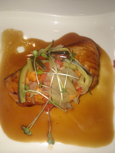 Cons: #1-hostess seated 2 guys in a section w/ a waitER! Gals, if a group (2 +) of guys walk into your restaurant they do NOT want to be waited on by some other guy. We want to look at, and flirt with, a hot female. [no carriage return on this app?] #2- My salmon was cooked a little long. Im not from this area, I was traveling and am used to, and assumed I would get, salmon that is cooked rare to mid rare. I didnt think of it when I ordered, but should have (but so should they). Around the area this may be the norm, but be aware of that.[return] Pros: Soft shell crab app - superb! Beef & asparagus app - very nicely done. Chef Recommended pork entree - superb! Salmon entree - see notes above, but otherwise quite nicely done. [return] For all his masculinity, the waiters service was friendly & very good. The decor was up to date & the eye candy present, if woefully distant. Definitely worth the visit, but ask about how your fish is cooked, and negotiate with your hostess regarding your seating.