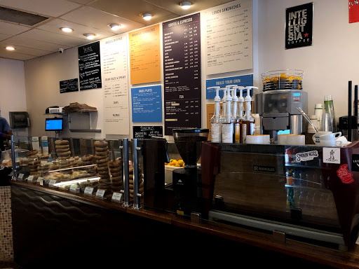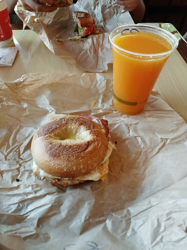 Excellent local bagel shop with fresh hand made bagels everyday. Perfect breakfast food and drinks with coffee and fresh orange juice available, and delicious lunch options available as well. Well worth the price.