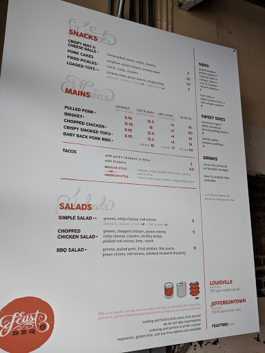 We came to Feast on the advice of colleague that recommended it as an authentic BBQ in the NuLu area. Coming from out of town, I always prefer to eat where locals go, and this turned out to be a good call here. When you enter the restaurant, there is a large menu on the wall that you place your order from directly in front of you at the register next to the bar. I ordered the half rack of baby back smoked ribs, sweet potato fries and when I was stuck on the second side, the employee suggested the mac-n-cheese saying its the best in Louisville. Sold. Lastly, after reading all of the reviews, I went with the Orange Creamsicle Bourbon Slushy. Awesome! Wood picnic style tables are setup in the main dining area where you set up the number you received at ordering. Shortly after seating, out comes the food. Giant portions of meat and sides sit in baskets on a stainless steel trail. The Ribs are OUTSTANDING! Smoked meat slides right off the bone and has just the right amount of char crusting sealing in the delicious pork. The Mac-n-Cheese is creamy and thick. Awesome! Ill add my voice to the choir of folks here that recommend having a Bourbon Slushy. Perfect compliment to excellent Kentucky BBQ fare. Definitely add Feast on your Bookmark of places to eat when in Louisville.