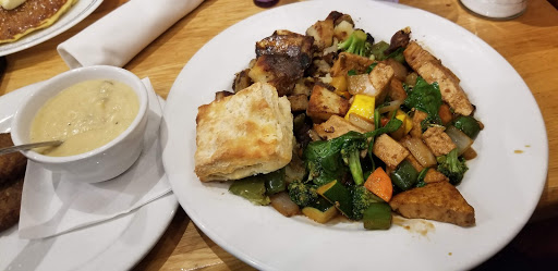 We went here for Valentines day because my beloved is a vegan. They had a few options but they were all dishes she can easily make at home. They still put sour cream on her plate. Also it was a mexican dish with no seasoning. I got the hearty breakfast. The grits, bacon and eggs were the best Ive ever had. The sausage however, was very stong Italian and would be much better suited for a pizza. The toast was kind of dry and the pancakes were a good quality buckwheat. I dont like buckwheat but with real maple syrup it was okay. We also got humus for an appetizer and it was decent. The pita bread was a bit scorched and at $6 I would have liked a little more of it. After tip we came in at $46 a little too much for what we got.