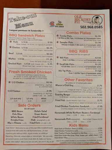 The prices have gotten way out of line. I asked for chicken BBQ with no bread and coleslaw and ice tea. She said, we have cornbread. That sounds good but can I have it on the side. So they counted the cornbread as a side. This cost me $11.70. I asked if you put the BBQ on top of the cornbread then I could have another side, she said yes. How ridiculous! When the food arrived there was just a little small bowl of chicken. It really want enough for a serving. I can honestly say I was still hungry when I left. I could of gone TX Roadhouse and got a steak, salad and baked potato for this much money. Believe me I wont be eating there real soon, because it just cost too much for what you get. This is nothing more than another business being real greedy. When I pay this much for food, I usually have enough to take home and have another meal. Shame on you Ole Hickory Pit!!!!