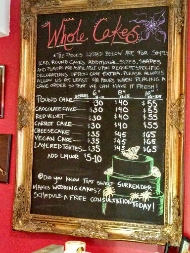 We had dinner at a nearby restaurant and wanted to do dessert elsewhere, so Google said this place had desserts so why not. Sweet Surrender Dessert Cafe has the feel of a cozy, hip, coffee shop, but with the added bonus of some very delectable desserts. After a very detailed discussion about each of the cakes, we made our selections. We each ordered a slice of cake and a cappuccino and wandered around the store looking at the artwork and digital pictures of some of their specialty cakes. Our slices and coffee came to us shortly and we enjoyed a pleasant and relaxed few minutes as we ate as much as we wanted before taking the rest home. The cake was excellent, not too sweet and very moist. They do have Vegan, and Gluten free options every day too, but we didnt try any of those this time. We will definitely make this a stop on future "date nights".
