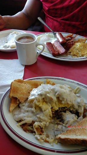 Me and husband practically lived here when we lived in madisonville! I love the waffles, biscuit and gravy(with sausage cut in it), coffee and chocolate milk and I absolutely love the brownie a la mode!. My everyday go to when Im pregnant too!