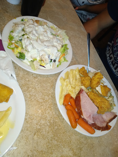 Family of six of us staf was great kept us in roles and coffee removed plates promptly.salid bar well stocked food bar had product that was dried out fish chicken mostly .Mac cheese had dried cheese stured in.