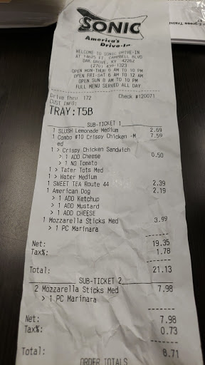 Both Sonics near Ft Campbell absolutely suck; i dont think Ive EVER gotten a completely correct order at either establishment. Not really sure how you get a chocolate shake mixed up with chocolate chip cookiedough (especially when you read it to me) or how you can ask for a fully loaded coney and give us a completely naked hot dog on a stale bun and then give us an attitide when we bring it back.