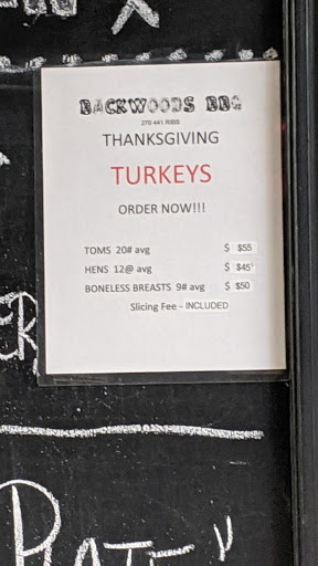 The first review by Carol is spot on: Backwoods is worth stopping for. I ordered a half-slab, and the meat just fell off the bone. Backwoods has some of the best barbecue Ive found, and I travel the whole country. Also, they dont skimp on the ice cream servings. Take exit 4 off I-24 and go west on U.S. 60. Its about a half-mile on the left, in front of the Lowes. Oh, and be sure to try their hash brown casserole when you choose a side dish.