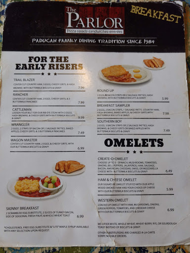 The Parlor has a very nice menu with a wide variety of choices - pizza, salads, sandwiches...even steaks are all very tasty & priced very well. The service can be less than good, but not so bad that we dont return.
