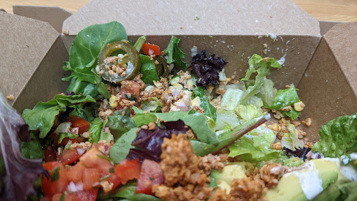 Coming from a self-proclaimed meat lover, this place is amazing. Everything on the menu is vegan and/or vegetarian. My favorite is the spicy chicken sandwich, extremely crunchy and actually pretty toasty on the spice. Wife loves the nacho bowls. Get some of the cookie dough to take home and make, that stuff is fantastic.