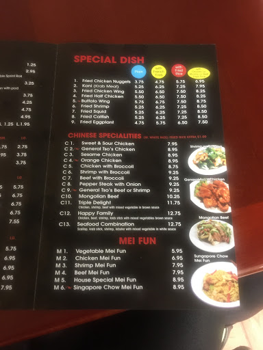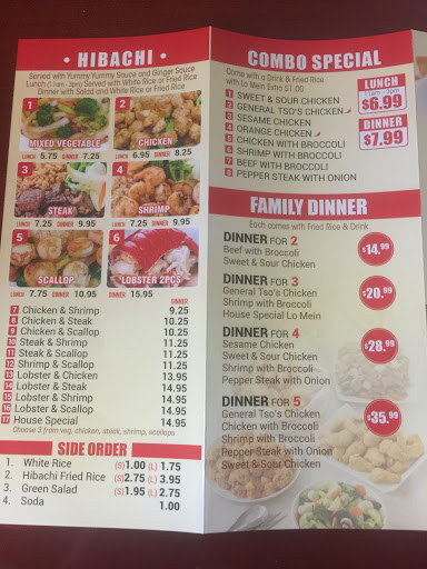 Good mix of traditional American Chinese and Japanese Hibachi (flat grilled). Large, LARGE portions. I had the Hibachi Beef /Shrimp. 10 oz steak, 7 grilled shrimp, 2 cups of plain fried rice, one cup of grilled mixed vegetables, a green salad and a glass of tea. for $12 including tax.