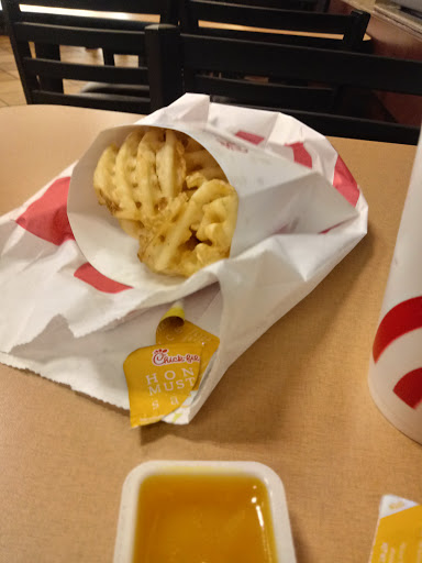 Wont lie. This is my least favorite chickfila. Food is good. But the staff is not nearly as upbeat and friend as the other chickfilas. The manager lady was the one who surprised me. Her tone was just kind of rude. They also dont offer the plastic kid table covers. When I asked for one they gave me the paper thing they put on the trays. = my 1&1/2 year old would just put on it and his food would fall all over. And his grilled chicken made the paper soggy. Should for sure rethink that.
