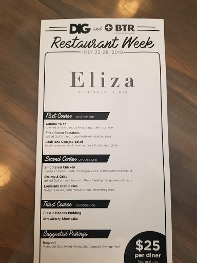 Went on Black Friday. Was still full from thanksgiving, so my wife and I ordered the crab and corn bisque and the Eliza House Salad. Fantastic. I highly recommend both items. The service was impeccable and our waiter kept us entertained with his wit and humor. We normally skip desert, but could not resist the banana pudding and strawberries and cream. To die for. Superb meal, great atmosphere, and excellent service made for a great evening. Have to return to try the crab cakes. Fine dining at its best, I highly recommend Eliza as a great place to dine.