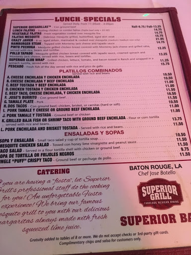 I visited Superior for the first time in a long time last night with high hopes. My salsa wound up having a very long black hair in it... which grossed me out so I sent it back. THEN, not too long after discovering the hair, the couple next to us found a ROACH in the mans taco after he had bitten into it. The wait staff seemingly brushed it off and didnt seem to care all that much... the manager was the only one that seemed semi-concerned. This was hands down THE worst restaurant experience I have ever had and the customer service was SEVERELY lacking. Its a pretty high priced place that prides itself on the best Mexican food in town (its not), and I do not recommend it to anyone... especially after my experience.
