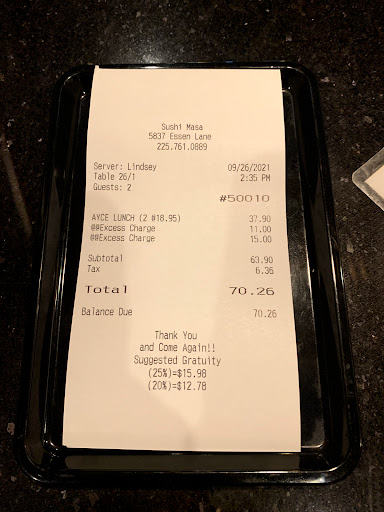 Let me start off by saying that the service was great here. I went on a Saturday and our waitress came to check up on us every three to five minutes to see if we wanted to order any additional rolls. Sushi Masa is not the typical sushi buffet restaurant. You order the dishes you want, as many as you want. There is no sushi bar. Also, be warned, you must eat at least 70-80 percent of the dish before you order another one or you will be charged for the ones left over. What makes this stand out compared to Nagoya, another sushi buffet in BR, is that it offers tempura rolls. If you love fried sushi, this is the place for you! The teriyaki chicken was also quite tasty however I found the chicken to be a little dry even with the sauce. The sushi I enjoyed most was the petite cucumber wrap sushi with imitation crab. A must try if you visit here. I also tried the ice cream here, both the green tea and red bean ice cream. The green tea ice cream is definitely better than the one at Nagoya in that it tastes more like green tea. Now for the cons, I found some of their rolls (the larger ones) to use non-sticky rice which made the individual rolls fall apart. It was a mess! Keep in mind that the service is fast during the weekend. I didnt have to wait more than 3-5 minutes for my next rolls to arrive. However, it gets really busy during the weekdays (e.g. expect to wait 5-10 minutes per dish to arrive at your table). For me, I think I will be sticking with Nagoya for now since I hate waiting no matter how short the waiting time is. Nagoya lunch buffet is around 11-12 dollars while the sushi masa buffet is 14-15 dollars but also includes a drink.