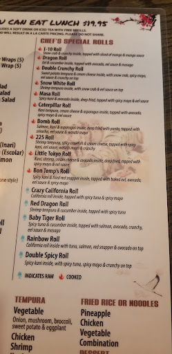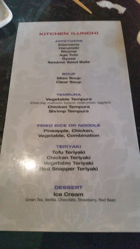 Just moved here from Los Angeles and my wife and I are just starting to check out the Sushi places. I took my wife here on 3/24 for date night. Made a reservation for 6, was there right on time and the place was deserted. We were sat at a table and our waiter "Brad" showed up right away and was cold as a fish to us. The entire time we were there, it was like we were burdening him to be there. Maybe he had an off night. I got the buffet my wife ordered off the menu. I will say that the mango salmon appetizer was amazing, then I ordered the LSU roll (Im adventurous, Ill always order stuff that is not in other sushi places). The rolls were HUGE, very good, the peppered tuna and tuna tazaki were really good too. The sushi pieces I ordered were a bit small, and the ikura was so lacking in eggs I just brushed it off as, the buffet sushi must be smaller in size, and you only get 1 per order, not 2 if youre on the buffet option. I will say the rice was very good. My wife liked the seaweed salad, but the mackerel sushi she ordered was NOT fresh, it had a fishy taste to it, which means that they DID NOT purchase their fish that morning. Then she ordered the fruit sushi roll and it did not come with described sauce, instead it came with strawberry topping sauce, we complained and they offered to take it back but we decided to keep it, it would have been nice to get what was written on the menu. The green tea was a bit thin, it always is, our japanese water guy was pouring the glass to make it greener as he agreed with us. Well be back, I want to try more stuff on their menu as they had A LOT of rolls to choose from. I give it a 3 because it just didnt blow me away, which means my standards for sushi must be higher than those that gave it a 5. Ill keep looking till I find a place that really does it for us to make our regular spot.