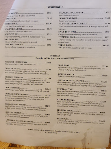 Very VERY overrated. I heard it was the best sushi restaurant in Baton Rouge but definitely tested better all around. The rolls were plain and food was nothing special. We ordered at least 7 rolls from the menu. Had a lobster roll and we didnt even taste the lobster in the roll. The food were VERY over priced; many was two times more expensive than Ive eaten anywhere else, and taste nothing special. Not a horrible restaurant but definitely not counted in the best 3. The restaurant interior itself might have been great if you cant see everyone eating right beside you. It was a open space environment and quite cramped. Eaten all over BR and definitely nowhere near amazing.