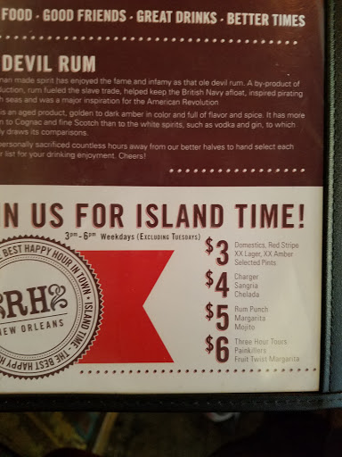 The menu is somehow both limited and expansive with nearly all items a delight. I have yet to order a plate meal instead opting for the mix-and-match taco menu ordered as two, three, or four tacos of your choosing. The number of side items differs with each combo. It is a ridiculous amount of food! The appetizers are also very tasty and varied. If you are hungry enough it would be possible to slip into a food coma before leaving the table. I have never had room for dessert so cant speak to that. The rum drinks are robust and quite tasty. It would be possible to range from the sweet fruitiness of rum punches to drier rum drinks. Beer selection is limited but you probably didnt come to "The Rum House" to drink beer. Well worth a visit! If you are just out to enjoy a lazy afternoon be sure to get one of the swing chairs at the outdoor bar.