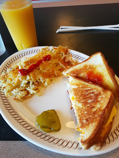 Went to this Waffle House based on the reviews- but this was probably the worst Waffle House Ive ever been too. The Waffle House shares a building with a lounge of some kind. The bathrooms were atrocious. Grime was caked on the walls, floor, counter, and mirror. The hand dryer was broken too and in its place was a steel rod holding a couple of paper towel rolls. After this, we waited a few mins in the waiting area before we decided to move on. The AC didnt work either and it was late June when we went. I wouldnt eat here if the good was free.