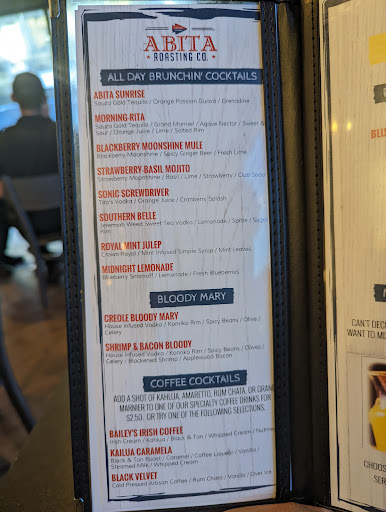 the food is amazing i love abita roasting!! but my waitress, her name was emily, made the experience a little less enjoyable. i had to ask her for her name because she didnt introduce herself. she also looked very non professional, as if she just rolled out of bed. she didnt ask us how our food was or interact with us at all. i love abita roasting company.