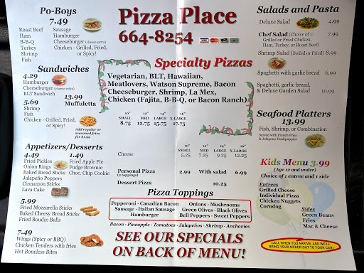 This is the best pizza I have ever had!!!!!! The menu has a good variety. Its not not just pizza. They also offer seafood, poboys, sandwiches, salads and more. All of the employees are friendly and professional. The dining room is clean. The dining room is comfortable.......almost like being at home. Pricing is very reasonable. Way better than the chain pizza places. The Pizza Place also has delivery in a limited area.
