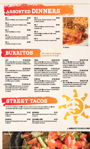 Classic Mexican food restaurant. A safe bet. Multiple combination platters that allow for a little of this and a little of that.