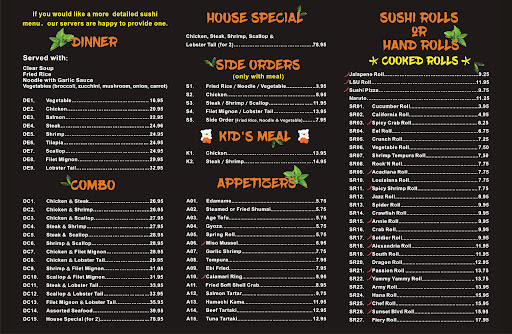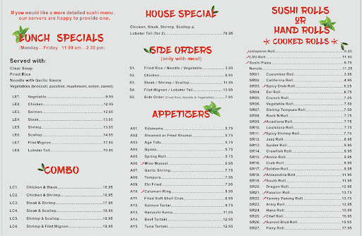 Take out over the phone the woman was pretty rude and i had to repeat my order five times bec she waant listening. The food inside however is amazing. The chefs do tricks with the food (juggle eggs around, toss shrimp in or mouth, catch the onions on fire) very friendly in dine in on both sides lots of choices with sushi.