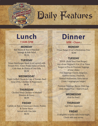 Ive been a server at Times Grill in Mandeville for many years. I loved the food on our menu the day I started and I love it now!! One of the best things about my job is the returning customers. I have the pleasure of seeing many families come back on a regular basis. The atmosphere at Times is great. Big screen TVs everywhere. People love to watch sports games while enjoying good food and ice cold drinks. If you havent been able to visit Times Grill in Mandeville, I suggest you try us out:)