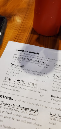 The hosts are always nice, courteous and helpful. The servers are prompt and cheerful. Times Grill has an extensive menu including everything from burgers to genuine New Orleans style entrees. The food is always served in large portions, hot and the way you asked for. Every table has a view of a wide screen flat panel television, and on game days, the restaurant plays the audio for the games. A simple request can be made to view any game, although LSU and Saints are the primary games watched. Even multiple games play on the different screens simultaneously. When the games arent on, music from the 60s, 70s and 80s plays while you enjoy your meal.