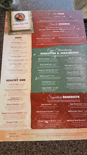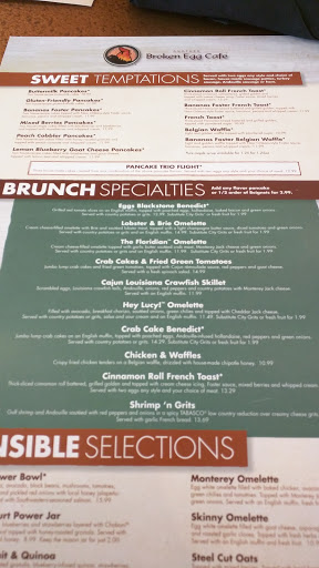 I just had breakfast there this morning. I took pictures of the place because it was my first time patronizing the place, and had come here to read the reviews beforehand. This is not a greasey grill, nor is this where you ought to go if youre worried about spending. I ordered the "Popeye Scramble" which had bacon, spinach mixed into the scramble, and melted cheese on it. The potatoes were cubed, and they tasted good. The scramble tasted fair. There was also a toasted muffin with a little cup of butter to the side, in case you wished to not do with the calories. I did. I also used the jam that was on the table in individual serving packets, but these were not the common fare youd find -- it was Dickensens brand -- and I found Pure Marion Blackberry, Pure Concorde Grape, and Pure Pacific Mountain Strawberry flavors. I also sampled their own brand of pepper sauce: Another Broken Eggs Pepper Sauce, by putting a dab on my spoon to taste, and THAT I would say could go. But you should know that this place is more for breakfast as a social occasion, to sit and enjoy with friends and good conversation. They even have a bar and serve wines and coffeed cocktails. I hope the pictures come through with this review. Take a look for yourself. If youre looking for value for your buck for breakfast, go to McDonalds which is right in front of Another Broken Egg, or go to some other greasy grill place. If youre discerning, willing to spend a little to be able to expect and demand attention, as well as enjoy a clean dining area, then this would suffice. My only possible reason to complain would be that I had to ask my waiter for more water. That came right away, as did my food order not long after Id ordered it. I gave it stars on all counts, but check it out for yourself. There is a menu online you can look at, and I just checked -- my pictures I uploaded are pending approval by Google before theyre posted. This cafe does not have paper napkins on the tables -- theyre cloth, so be fair in your expectations and assessment. I went there to treat myself, and it was a treat.