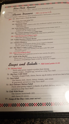Our server was more concerned with another server taking her table than waiting on us. The catfish special was very very bland. No spices in the meals at all. The opposite of whst you would expect from a local diner. The server forgot about our salads. Then served them with the wrong dressings. They had a customer just sitting sound asleep over their meal and newspapers the entire time we ate. It was 1:30 p.m. I think that is inappropriate to allow. We will not be eating there again. First and last time.