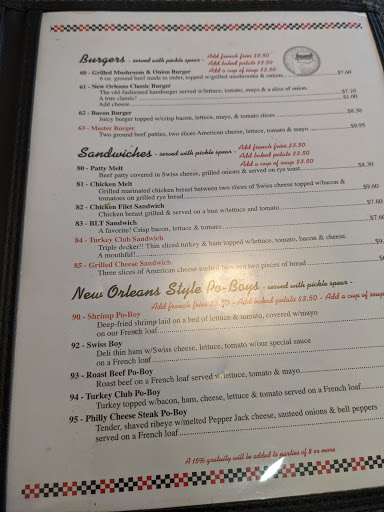 Ate dinner there on 10/11/2015. We were a family of 4 and were seated right away. The items on the menu seemed a little pricy. We got our food, everything looked good, however it didnt have much flavor. My husband got shrimp/catfish which looked and tasted as if it had came our of a bag in the freezer. The rest of us got hamburger/cheeseburgers. They had no taste. Mine even had onions/mushrooms on it. The bill came $52 for 3 burgers and 1 dinner with 4 drinks. We could have ate somewhere great for that. The service was ok. I asked for a to-go drink. She offered me a cup, but I asked if I could have a fresh one because mine had been sitting for a bit and was watered down. She said ok. Then I saw her talking about me to a co-worker. She didnt realize I could read her lips. That did not make me happy. We were full when we left, but I do not plan on going back.