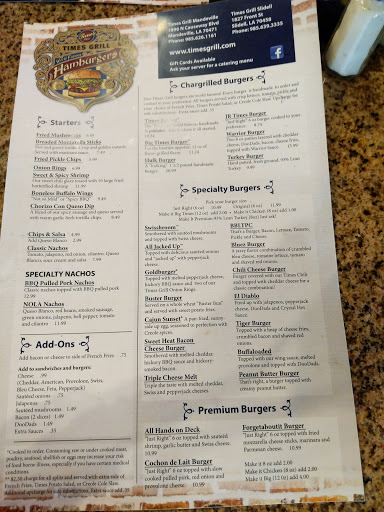 I love the food at Times . They have excellent hamburger. We now eat the low calorie teriyaki chicken it is very good.We always go to the Mandeville location at least once to twice a week. Great food and very good service.