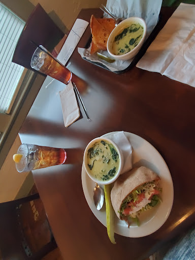 Great food, service and atmosphere! We had the spicy shrimp sandwich, pesto pizza and the Bluesy chicken salad and it was all great! We sat out on the patio on a very hot day but it was very comfortable. Fresh ingredients in food and came out fast during lunch rush.