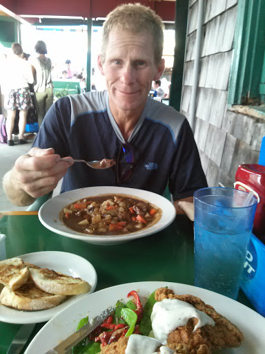 We sat on the patio since were allowed to have our dog. We ordered the nachos with chicken and it is a good thing the waitress told us how big it was. The nachos were layered with toppings top to bottom. The nachos were really good. We had a lobster roll, and while expensive, tasty. They have a great selection of local craft beers. Had our first, and only exposure to a Maine hotdog, it is pink. Fortunately it was for the dog.