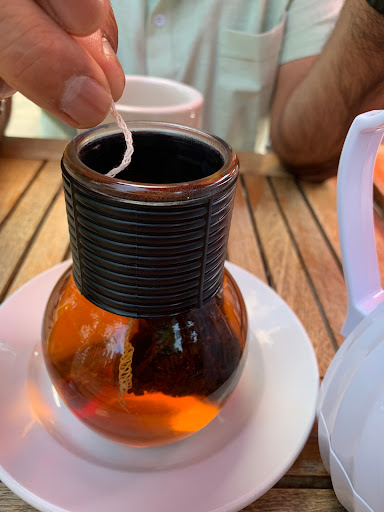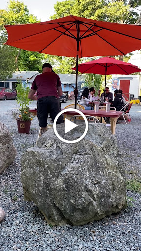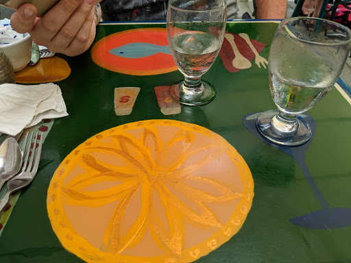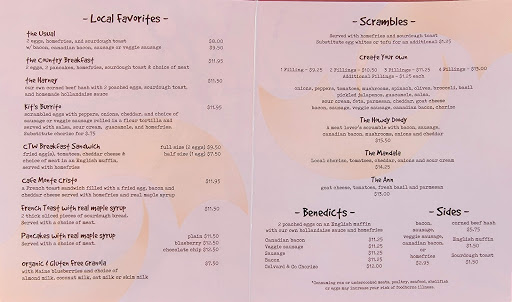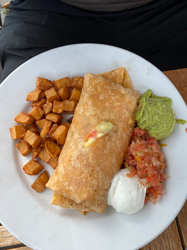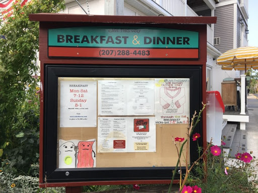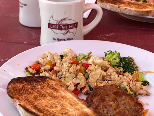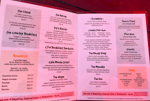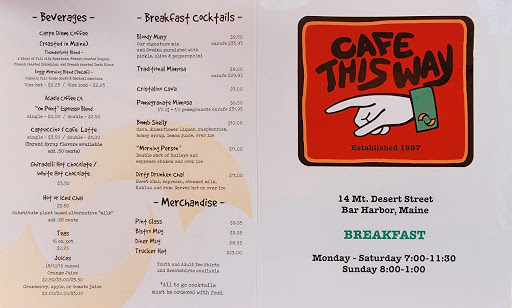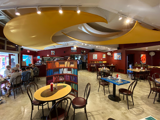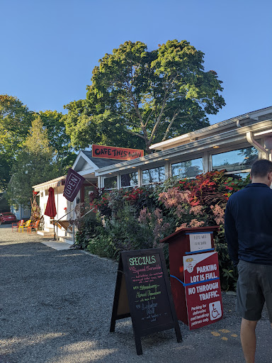 This place is a must. Weather permitting, they allow dogs on the covered porch area. Even though it was a bit late, a little busy, and a bit chilly, they let us on the porch with our pup as long as we didnt mind there being no heat. Our poor waitor braved the chill and served us without blinking an eye. The food here is phenomenal if you dont mind a different take on things. The shepherds pie is nothing like what you would expect; the base was a Croquette with layered mashed potatoes and corn chowder. Had a tantalizing mint watermelon salad for an appetizer and the desserts were delicious, hand-made in house or by a local place around the corner. We came back for breakfast and its the same as before; food was delicious and interesting, service was warm and impeccable. The atmosphere is charming. The little unassuming shop is nestled down a driveway out of view. The porch is sectioned off by a garage door that they open (weather permitting) to allow more guests and dogs to join the show. A book wall behind us was jammed full of sea worthy novels and salty titles. The ceiling has an artistic installation of the cafes logo, which resembles a whirlpool. Cafe this way does it their way, Artfully and delicious... I love it.