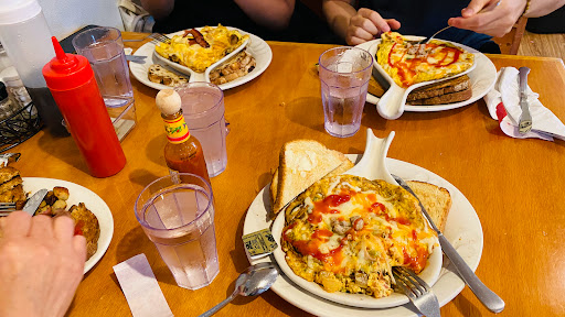 I ordered breakfast skillet and what I was served was eggs with tons of cold shredded cheese dumpedal on top. The cold cheese made my eggs cold and it wasnt very enjoyable. The food looked like it was prepared in a rush because my to toust was burnt. Our waitress was not very friendly and forgot about us. We sat there for almost 15 minutes waiting for our order to be taken, only when I flagged her down did she come to take out order. The waitress dropped our food and for the secone time I had to flag her down to ask for the check. She never checked on us during our meal, my partner was not offered another drink. We were not offered any kind of customer service, never asked if we needed anything. I truly believe that if this restaurant was not in the center of town it would not be a success. Since its right in town its convenient but its not worth the the money!!!
