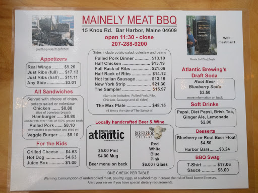 We received a great tip from a couple who had frequented this restaurant that I would like to pass on to future patrons "As a couple, order the sampler to split. Only rookies order one for each person!" Wow were they right! The sample included pulled pork, ribs, chicken, sausage, baked beans, cole slaw and potato salad. And Im not just saying samples of those meats. There was a full italian sausage, at least 1/2 pulled pork meat, half of a chicken breast, and a half slab of ribs! Each of the sides were at least a half of a cup. It was almost more food than both my husband and I could conquer!! (Oh, and the meal came with corn bread!) And every morsel was delicious. To add to this amazing meal was the blueberry soda! YUM! I believe this soda was brewed on the spot, and it rocks. My favorite part of this dinner: the sampler platter was only fifteen bucks. Hands down the cheapest meal we had on MDI. And one of the very best!! After enjoying our meal at Mainly Meats, we headed over for the brewery tour and tasting at Atlantic Brewery (same owners, next door). The tour was exceptionally crowded and I didnt hear much of what he said, but from what I could hear the young man giving the tour did seem very excited and knowledgeable about the products and how theyre made. It was very interesting to hear and see what a small building can produce!! The brew tasting was very much our favorite part of the tour. With five beers to try and two sodas, it lasted quite awhile and was so much fun. I discovered I am NOT an IPA person, but I loved their blueberry ale! If you like beer at all, even just a little, this stop is absolutely worth it!