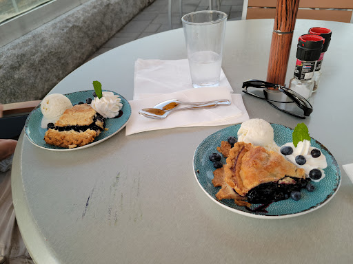 Wow! What a view and what an amazing experience. We were seated at a table overlooking the harbor and were hungry for lunch. We ordered the lobster special and split it along with a cup of lobster bisque. The soups came out first and were very good. The lobster bisque was creamy and had few, but good lobster pieces. The clam chowder was loaded and had a nice ratio of clams to potatoes. Up next was a delicious blueberry corn muffin (the waitress was super awesome and brought us an extra muffin). Following the muffins came out an ample amount of clams and muscles with butter and clam juice for dipping! The main course came next, the lobster. It was served in a pre cracked shell, making the work you needed to do much easier. It was well cooked and came out easily. Lastly, we had our dessert. It was a blueberry pie served with a sliced strawberry and a dollop of cream. The pie had a buttery crust and disappeared quickly. This is an excellent choice and we hope to come back here again!