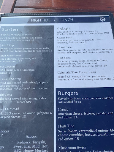 If you ask 10 people about High Tide I am sure you will get 10 different opinions....here is mine. I was there 2 days ago. I will never go back. My family and I waited 30 minutes to get a menu and water. We waited another 35 minutes before we placed our order (still no bread either - we had to ask for it). Then a whopping 40 minutes later our meal shows up and if it had been good food, all would be forgiven but the lobster was rubbery/tough and the baked potatoes were hard and cold. Im sorry but the views just do not make up for the really poor service. I have other family coming to town this weekend and they wanted to eat at High Tide but they now have made plans to eat at Timber.