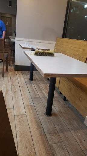 Floor feels just gross. Had to clean a table ourselves before using it. Not busy. Lots of staff yet filthy.