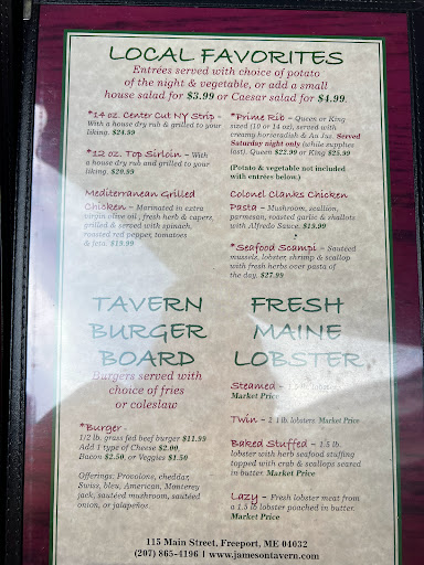 Small tavern on a side road in Freeport. Ate there on a whim and had a terrific dinner. The prices a reasonable and the portions are more than fair. My sister and I ordered crab cakes, salads, shrimp & fries and baked seafood dish. All passed the taste test. The waitress was efficient...never wrote a thing down and forgot nothing. Checked on us several times. Kudos Jamestown Tavern youve earned 5 stars from me.