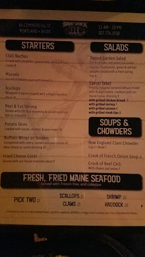 Out standing, we were visiting Portland From Charleston and had Lunch at the Dry Dock. Everything we had was perfect, The service was fast and very good, sitting on the deck the second time we ate there was even better. You can see lobster boat and enjoy the sun. They have an Bloody Mary that is exceptional.