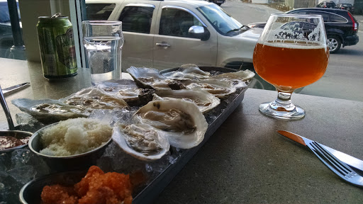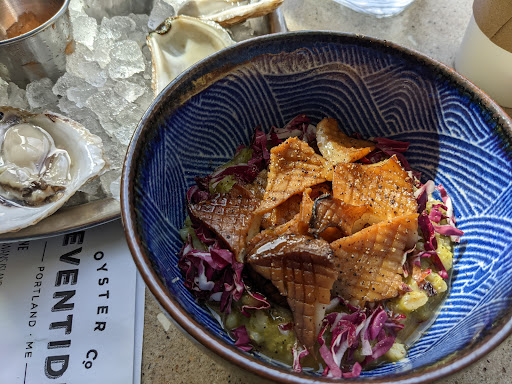 Eventide is an awesome restaurant in Portland that often has a ridiculous wait for good reason. If you get in at 5 or even just before 6, you may be able to get a table in less than 3 hours. Depending on the hostess, you may or may not get a text confirmation which makes it much easier to find a nearby bar to hang out at instead of the street. Best of all, they are dog friendly at the outdoor tables which are quite nice and a little less overbearing like inside. The beer menu is good with a few local craft beers on tap, though not huge. The inside is cool with a huge raw bar. Service is good and pretty fast, but definitely doesnt rush you or the people whose table you are waiting for out. The food is exquisite. Anything from the sea is amazing and worth a visit. The best way to approach the menu is like tapas and just pick a few things that sound interesting and let the staff suggest a few more for you. The oyster shooters are a great place to start and you can get your paired with the spirit of your choice. The jalapeno vodka was a good one to take away some of the fishiness of the oyster and ended up complimenting it well. The octopus salad was delectable and stacked up well to the excellent ones we recently had in Croatia. No rubberiness or burnt flavor here. Just huge tentacles in a nice glaze with some tasty veggies. Its sort of like discovering a giant sea squid under the murky depths of lettuce. Jacques Cousteau would be proud. The green curry lobster stew was one of the more interesting dishes as it managed to merge two things I love, without ever having thought to put them together, and pulled it off well. The coconut curry soup was a very good thai one with excellent and succulent lobster bits in it. Somehow this went amazingly together and no one else seems to have figured it out. The lobster roll was good, but a different type than you may expect. The brown butter and bao bun made it feel a bit more like a bbq roll and the taste was a bit more like korean bbq. This was fine, but dont expect a huge Maine style roll. The bbq fried oysters were absolutely stunning. They looked great with huge shells and a colorful palate of stuff on them, and tasted even better. The crispy potatoes lent a great texture to the dish and the cabbage gave a nice tanginess. This was the waitress favorite and it was so good, we ordered a second round. The crab roll was good, but the least memorable of the dishes. It could use some color to be a bit more appealing as it is white meat on a white bun. However, it was quite tasty and definitely on the good end for a crab roll. Maybe there just isnt much more you can do with a crab roll. We typically only get dessert is a meal is off the chart, and so naturally we went with the ice cream sandwich. It came with great ice cream inside a huge cookie and was nothing like a normal ice cream sandwich. It was just delectable. If we werent ready to lay down and die in the street, we would have had a second.