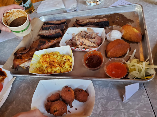Great atmosphere with high ceilings and open old farmhouse dining hall setup within renovated red stone brick building. Very casual bbq dining without waiter/waitresses... efficiently order food and non-alcoholic beverages at location near front entrance and give you a flag with number to place at your table for food to be delivered when done. Large bar area with very large selection of great craft beer. Had live music/band playing in corner of building which had chic setup with couches and lounge chairs to relax. BBQ chopped pork and brisket was very good. Pork ribs had slightly spicy dry rub which was well balanced, but ribs were merger on meat to bone ratio (not much meat per rib).... but note you pay by pound not by number of ribs. Have choice of house BBQ sauce (tomato based) or thinner BBQ sauce (vinegar based). The chilli was very unique with deep dark color very rich flavor and meld of flavors - which I thought was very good and very hard to discribe as not generic standard chilli flavor.