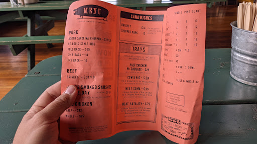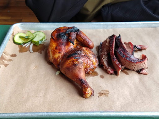 Had the St Louis ribs and half a chicken. Possibly the best BBQ until you hit NYC, everything was a hit. The collard greens were excellent, and more so commendable due to the visible lack of pork in them. Dont get me wrong, pork is amazing in collards, but they can make it great without this thing that we all assume is essential, so major kudos. The Mac and cheese was pretty good too, but its probably not their strongest work. The BBQ sauce selection is good, and while the banana one is very interesting and quite good, I have yet to think of a food that I would eat it with, aside from perhaps some kind of dessert? Ice cream maybe? Beer selection is well curated and service at the bar was very pleasant. On a technical note, it looks like it can get a little smoky in there, and while thats awesome and it smells good, you do take the smell home with you, so Id definitely RECOMMEND YOU EAT HERE, just not in drycleaning-only apparel.
