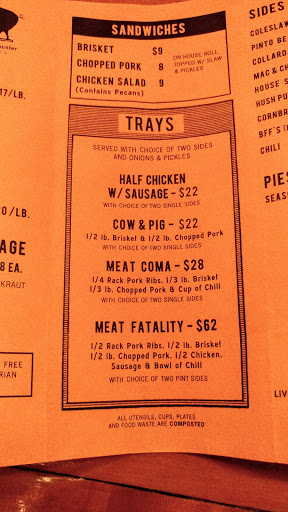 Whats so incredibly disappointing about Salvage is that it is both incredibly good and almost hilariously bad at times. The ribs, for example, are perfect--just dont expect much variety. Same goes for the chicken, which is so good youll want to ditch your silverware and just go at it caveman-style. The sausage, on the other hand, is merely passable. The macaroni and cheese is where things start to take a real dive (the cheese, in particular, was almost chunky in consistency). But its the chili where things go horribly, laughably wrong. The chili "sauce" tasted like a mixture of concentrated tomato paste mixed with gallons and gallons of grease and oil. It was like leftover Indian food that had separated overnight, except no amount of stirring could bring it back to life. And the chili itself: meat was indistinguishable from vegetables. I was unable to eat more than a couple of spoonfuls before throwing it away in revulsion. Decent beer selection, really nice atmosphere, OK location, food availability can be sporadic however. Get there early if you want to ensure your favorites are available.